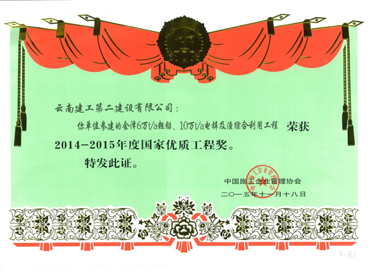 9 | 云南驰宏锌锗股份有限公司20万吨/年铅锌资源综合利用环保节能选冶技改项目 | 国家工程建设质量奖审定委员会 | 2007 | |